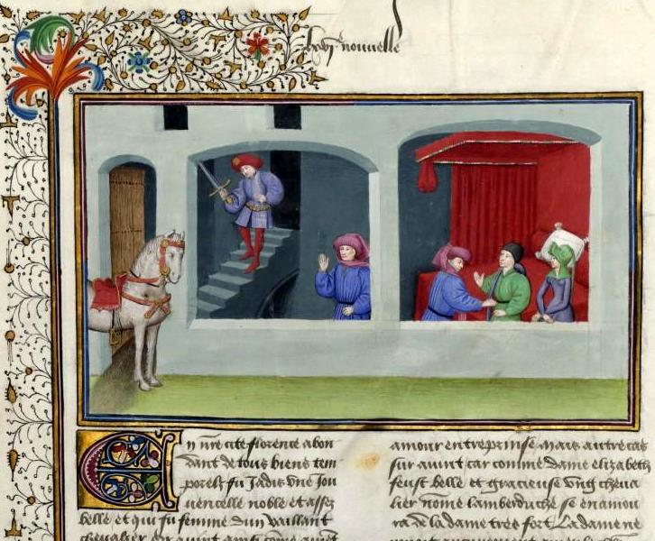Settima giornata, sesta novella: "Isabella, sorpresa dall'uno, occulta l'altro. Ma torna il marito, e architetta allora un piano per nascondere la doppia tresca". Miniatura tratta dal ‘Decameron’ (codice del XV secolo), Bibliothèque de l’Arsenal, Parigi.