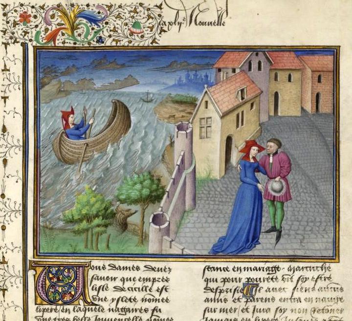 Quinta giornata, seconda novella: "Gostanza ama Martuccio. Lo crede morto ma lo ritroverà a Tunisi, ricco e potente. Si sposeranno per tornare, insieme, a Lipari". Miniatura tratta dal ‘Decameron’ (codice del XV secolo), Bibliothèque de l’Arsenal, Parigi.
