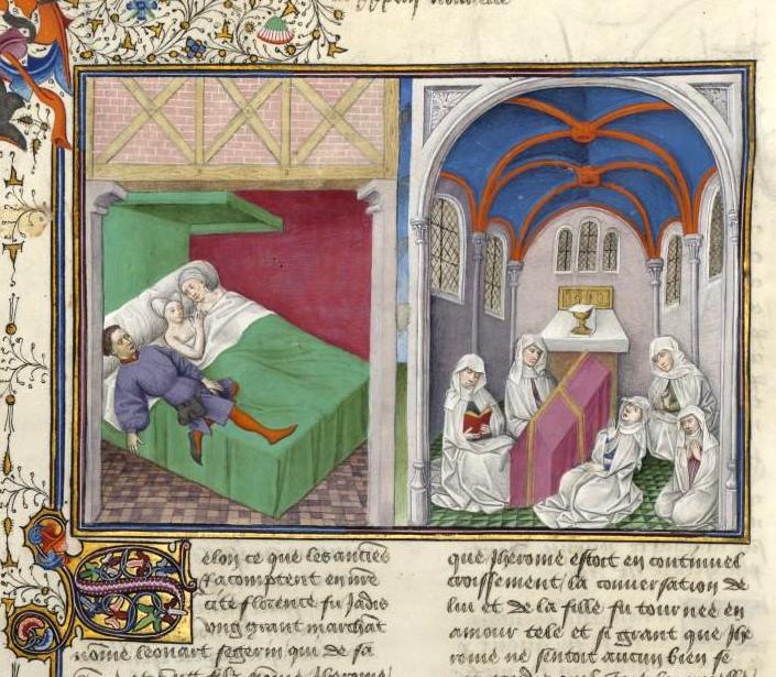 Quarta giornata, ottava novella: "Girolamo e Salvestra si amano, osteggiati. Divisi a lungo, si ritrovano: lei è sposata. Muoiono entrambi, prima lui e dopo lei". Miniatura tratta dal ‘Decameron’ (codice del XV secolo), Bibliothèque de l’Arsenal, Parigi.