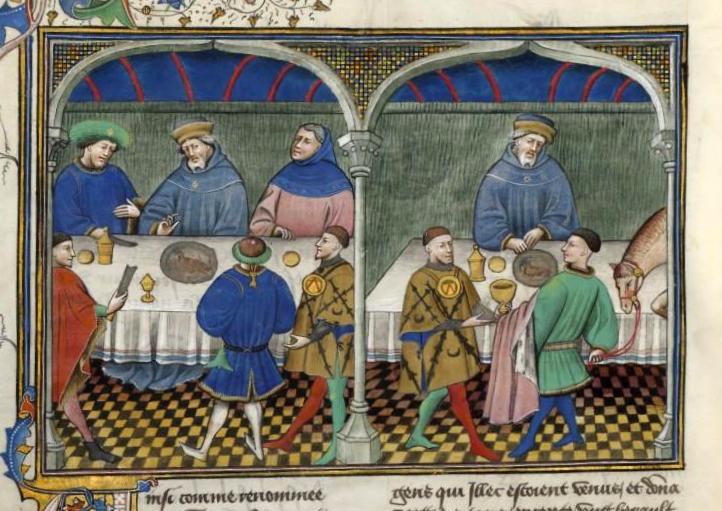 Prima giornata, settima novella: "Bergamino racconta a Can Grande una novella sulla munificenza. Ne ottiene in premio per l’arguzia denari, vesti e un palafreno". Miniatura tratta dal ‘Decameron’ (codice del XV secolo), Bibliothèque de l'Arsenal, Parigi.