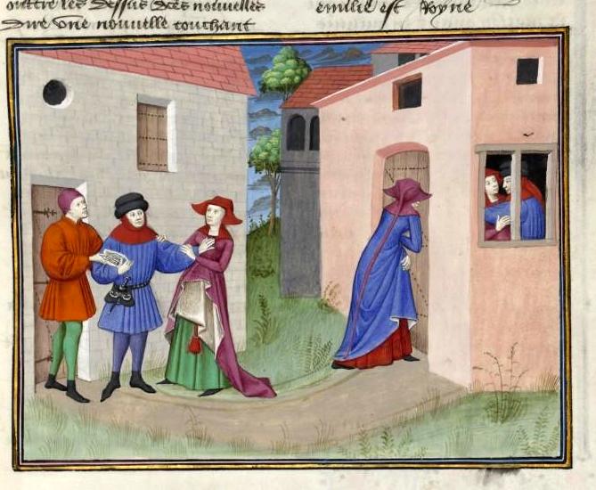 Nona giornata, quinta novella: "La Niccolosa è donna procace, fa la civetta e molto gli piace. Ma quando arriva l'irata moglie gli fa scordare tutte le voglie". Miniatura tratta dal ‘Decameron’ (codice del XV secolo), Bibliothèque de l’Arsenal, Parigi.