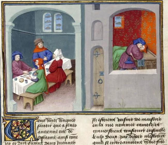 Ottava giornata, ottava novella: "Giace con la moglie di un amico che per contraccambio gli rende la pariglia. Finiranno per condividere le consorti in amicizia". Miniatura tratta dal ‘Decameron’ (codice del XV secolo), Bibliothèque de l’Arsenal, Parigi.