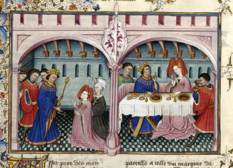 Prima giornata, quinta novella: "La marchesa di Monferrato offre al re solo galline a cena. Il senso è: sono tutte uguali, come le donne: che ne tenti un’altra". Miniatura tratta dal ‘Decameron’ (codice del XV secolo), Bibliothèque de l'Arsenal, Parigi.