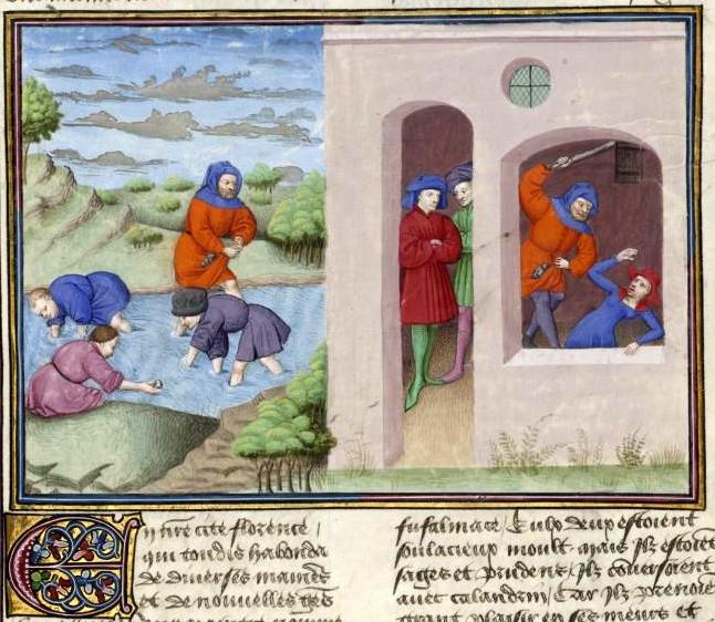 Ottava giornata, terza novella: "Un grullo, persuaso da amici d'aver trovato la pietra dell'invisibilità, batte la moglie, rea d'averlo riportato alla sventura". Miniatura tratta dal ‘Decameron’ (codice del XV secolo), Bibliothèque de l’Arsenal, Parigi.