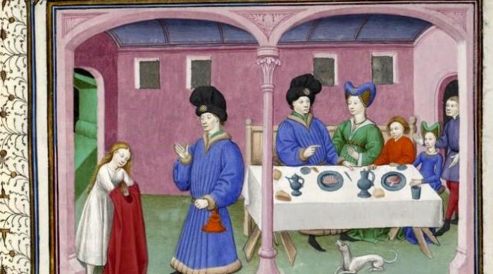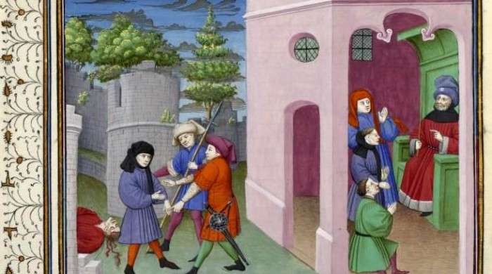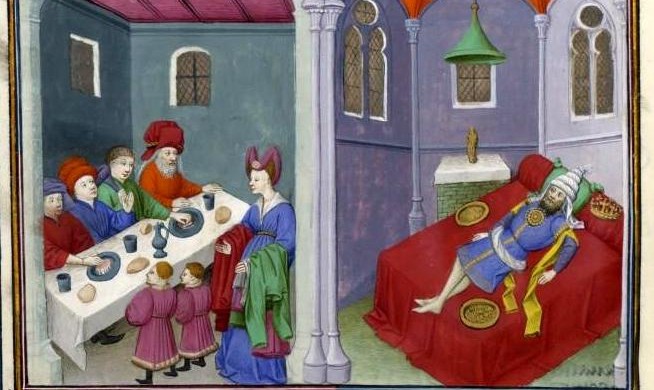 Terza giornata, nona novella: "Giletta guarisce il re per l'amore del conte di Rossiglione: lo indurrà a volerla e risposarla con l'ingegno e la perseveranza". Miniatura tratta dal ‘Decameron’ (codice del XV secolo), Bibliothèque de l'Arsenal, Parigi.