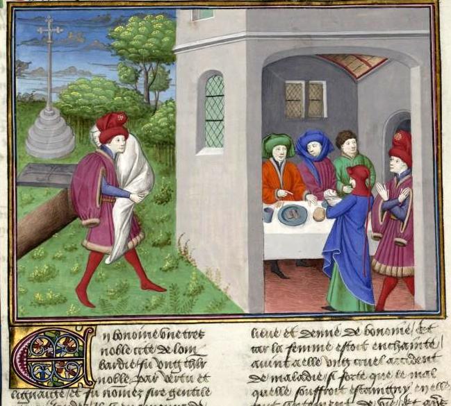 Decima giornata, quarta novella: "L'han sepolta. Per fatalità non è morta e vien riesumata: dall'uom che ancor viva l'ha amata, ma al marito, alla fin, la ridà". Miniatura tratta dal ‘Decameron’ (codice del XV secolo), Bibliothèque de l’Arsenal, Parigi.