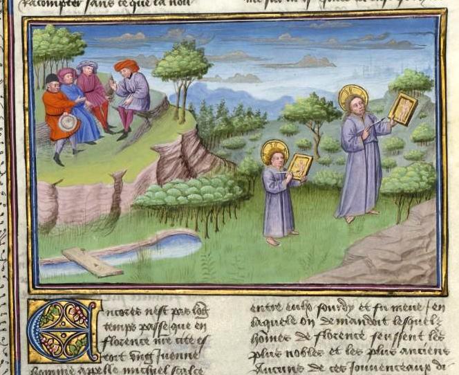 Sesta giornata, sesta novella: "Michele vince una cena. Prova i Baronci come la gente più antica e così brutti perché fatti da Dio quando era ancora inesperto". Miniatura tratta dal ‘Decameron’ (codice del XV secolo), Bibliothèque de l’Arsenal, Parigi.