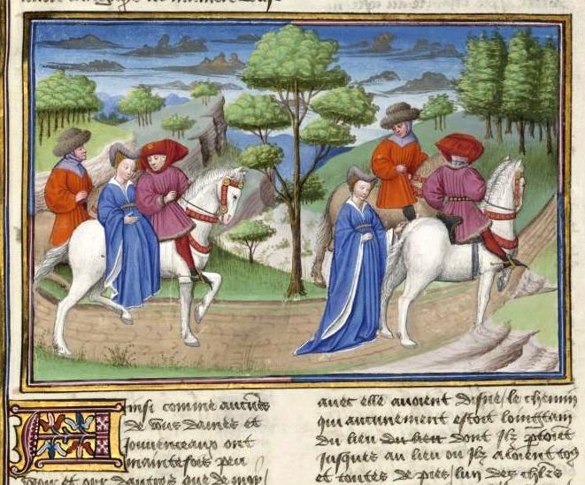 Sesta giornata, prima novella: "Un gentiluomo dice a Oretta che la porterà a dorso di una novella, ma la racconta così male che lei lo prega di farla scendere". Miniatura tratta dal ‘Decameron’ (codice del XV secolo), Bibliothèque de l’Arsenal, Parigi.