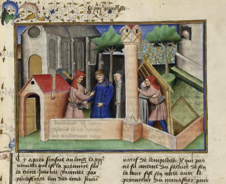 Terza giornata, prima novella: "Masetto si finge muto, è ortolano in un convento. Stremato dalle richieste delle 8 monache, minaccia lo scandalo per liberarsi". Miniatura tratta dal ‘Decameron’ (codice del XV secolo), Bibliothèque de l'Arsenal, Parigi.