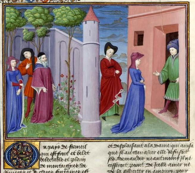 Decima giornata, quinta novella: "Il marito è un uom liberale, chi ne ama la moglie è leale. Rinuncia dunque al premio promesso, e il negromante farà lo stesso". Miniatura tratta dal ‘Decameron’ (codice del XV secolo), Bibliothèque de l’Arsenal, Parigi.