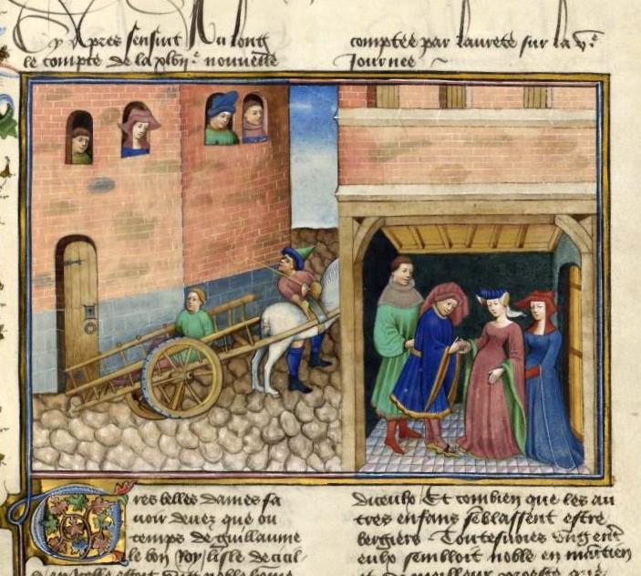 Quinta giornata, settima novella: "Violante e Pietro si amano. Il padre di lei la trova però incinta, e manda Pietro a morte. Sarà il genitore di lui a salvarlo". Miniatura tratta dal ‘Decameron’ (codice del XV secolo), Bibliothèque de l’Arsenal, Parigi.