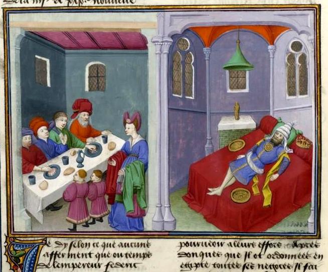 Decima giornata, nona novella: "Due fanno a gara di cortesia: prima Torello, in quel di Pavia, poi Saladin: lo fa prigioniero e infin ricambia da amico vero". Miniatura tratta dal ‘Decameron’ (codice del XV secolo), Bibliothèque de l’Arsenal, Parigi.