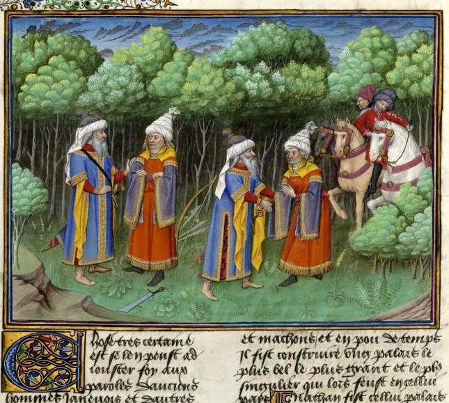 Decima giornata, terza novella: "Invidia quell'uom liberale a un punto tal che lo vorrebbe morto. Ma quand'è lì e gli può far del male capisce proprio d'aver torto". Miniatura tratta dal ‘Decameron’ (codice del XV secolo), Bibliothèque de l’Arsenal, Parigi.