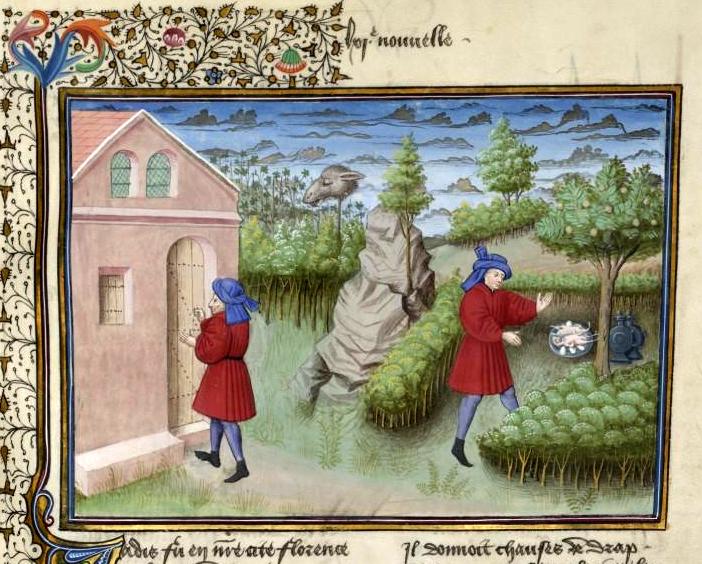 Settima giornata, prima novella: "Tessa convince il marito Gianni che alla loro porta nottetempo bussa un fantasma. In realtà si tratta del suo amante, Federigo". Miniatura tratta dal ‘Decameron’ (codice del XV secolo), Bibliothèque de l’Arsenal, Parigi.
