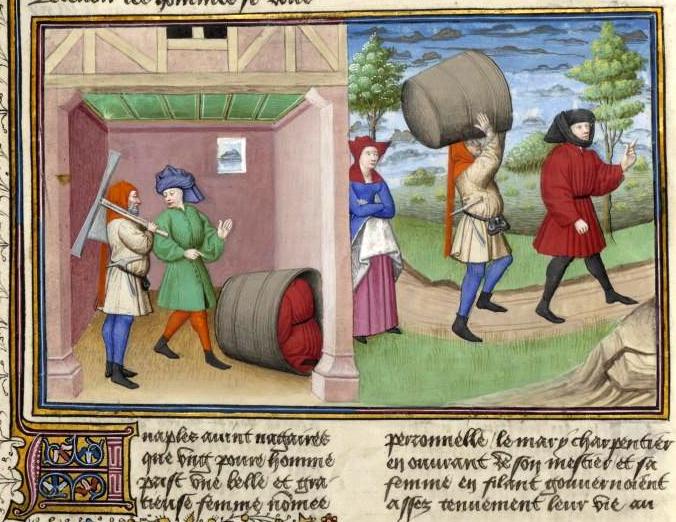 Settima giornata, seconda novella: "Lo convince che l'amante, ch'era nascosto in un tino, lo sta esaminando per comprarlo. Il marito lo pulisce, loro si divertono". Miniatura tratta dal ‘Decameron’ (codice del XV secolo), Bibliothèque de l’Arsenal, Parigi.