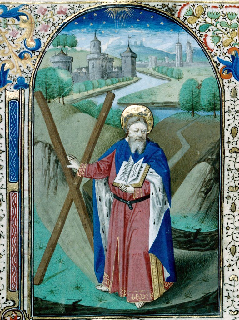 “Sant’Andrea”, miniatura tratta dal “Messale di Autun”, ms. 0114 A (S136) c. 222, 1460 circa, Bibliothèque municipale, Autun.