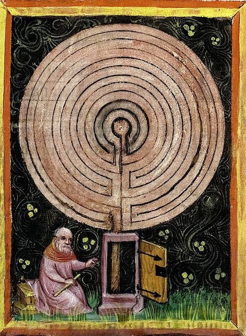 "Il labirinto", miniatura tratta dal 'De Rerum Naturis' di Rabano Mauro (1425), Biblioteca Apostolica Vaticana.