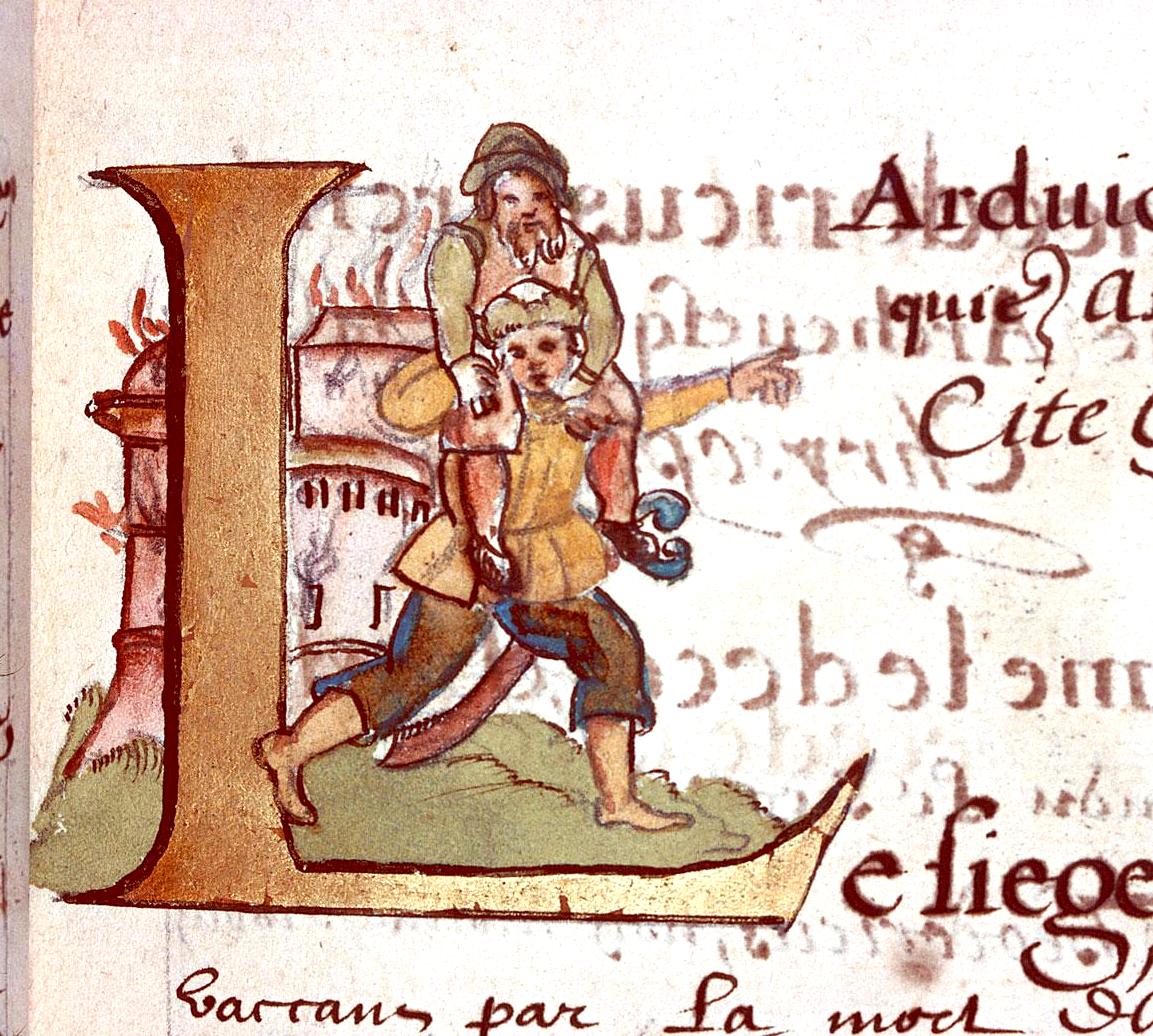 Iniziale "L", illustrazione tratta da 'Catalogue et vie des évêques et archevêques de Besançon' (fine XVI secolo), Bibliothèque municipale, Besançon.
