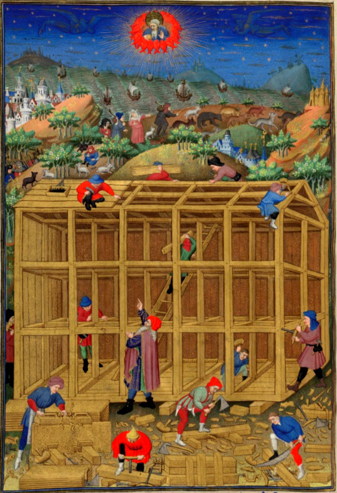 "Noè sovrintende alla costruzione dell'arca", miniatura tratta dalle 'Bedford Hours" (Francia, a partire dal 1410 circa), British Library, Londra.