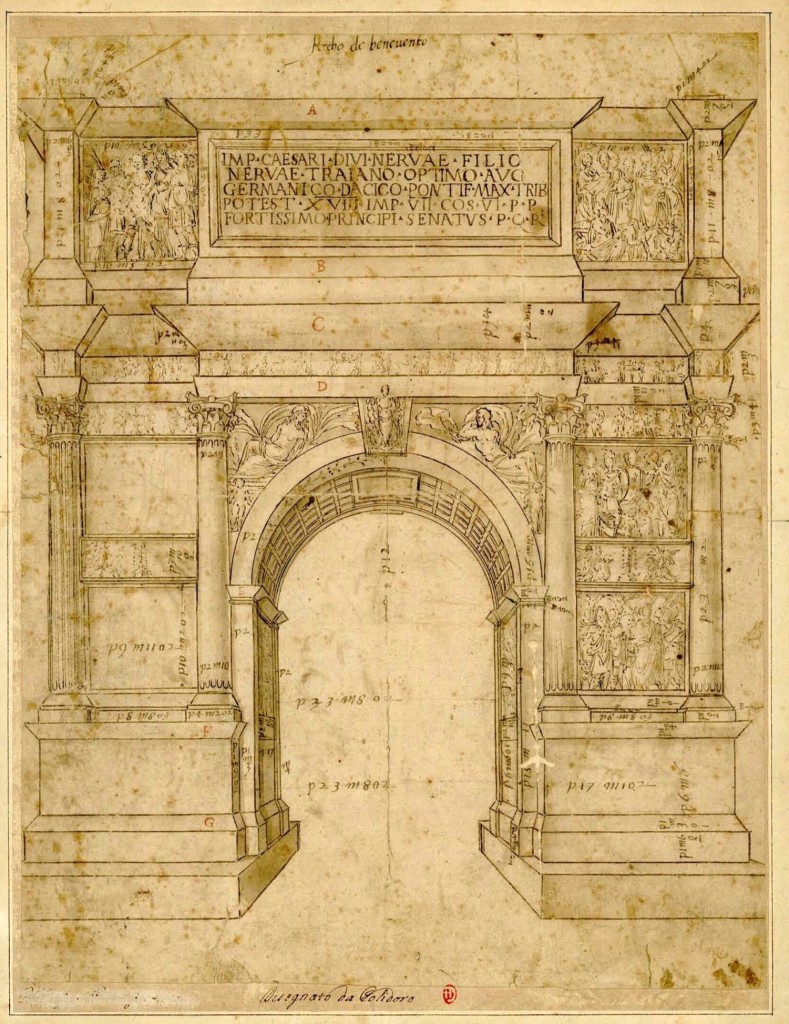"L'arco di trionfo di Benevento", disegno di Polidoro da Caravaggio (XVI secolo), Bibliothèque de l'Institut National d'Histoire de l'Art, Parigi.
