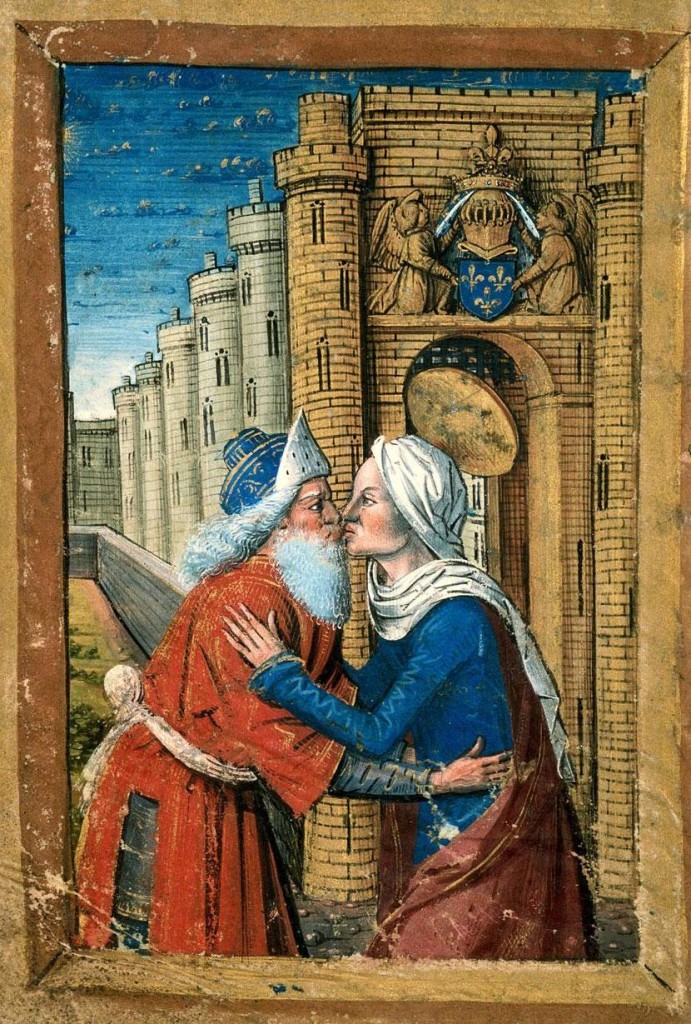 "L'incontro di Gioacchino e Anna alla Porta Aurea", miniatura tratta da Libro d'Ore (fine XV secolo), Bibliothèque municipale, Carpentras.