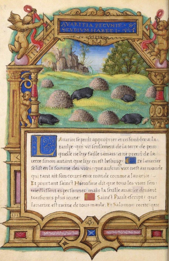 "Le talpe, simbolo dell'Avarizia", pagina tratta dal 'Fleur de Vertue' (Francia, XVI secolo), Bibliothèque nationale de France, Parigi.