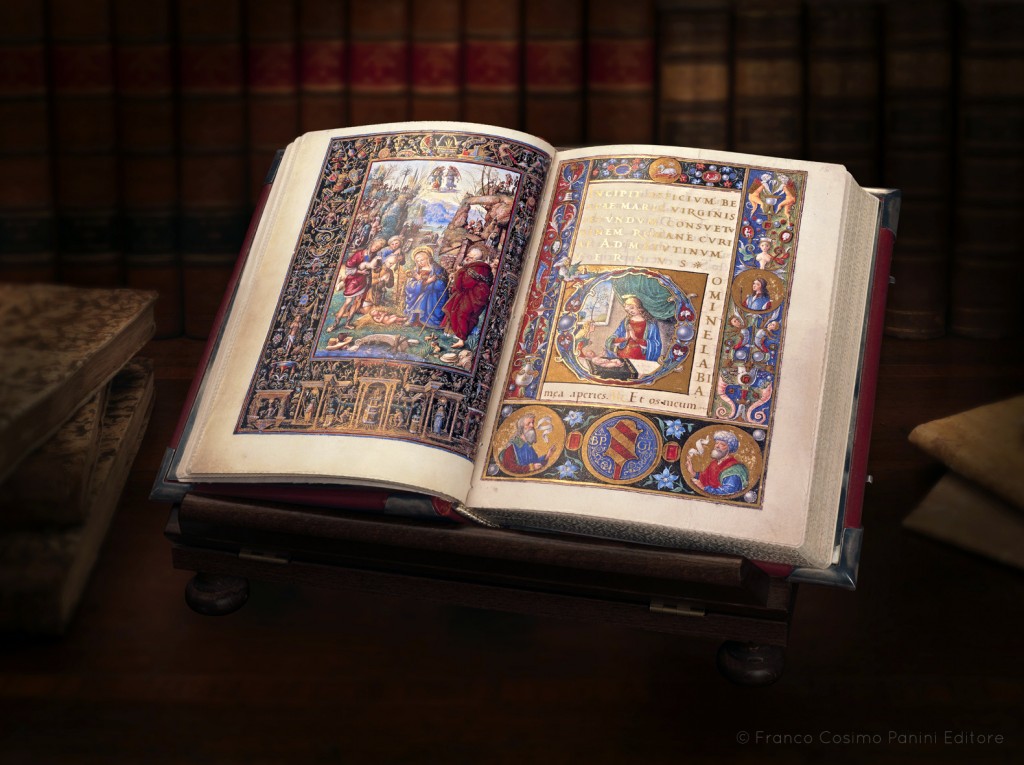 Il Perugino, Lorenzo Costa, Francesco Francia, Amico Aspertini: nessun altro codice miniato può vantare una rosa di artisti di questo calibro. A ognuno di essi Ghislieri chiede di dipingere una miniatura a tutta pagina, per racchiudere nel libro il meglio della pittura italiana dell’epoca. A coordinare un’equipe così straordinaria è Matteo da Milano, uno dei maggiori miniatori dell’epoca, autore di capolavori assoluti come il Breviario di Ercole I e il Libro d’Ore Torriani: sono suoi gli splendidi bordi decorati con motivi floreali alternati a castoni con pietre preziose e perle, impreziositi da sorprendenti effetti trompe-l’œil. Nella sua Annunciazione, ad esempio, il miniatore dà sfoggio del suo minuto e prezioso descrittivismo (si vedano i fregi raffinatissimi delle architetture), mentre il paesaggio sullo sfondo sembra ispirarsi a Dürer.