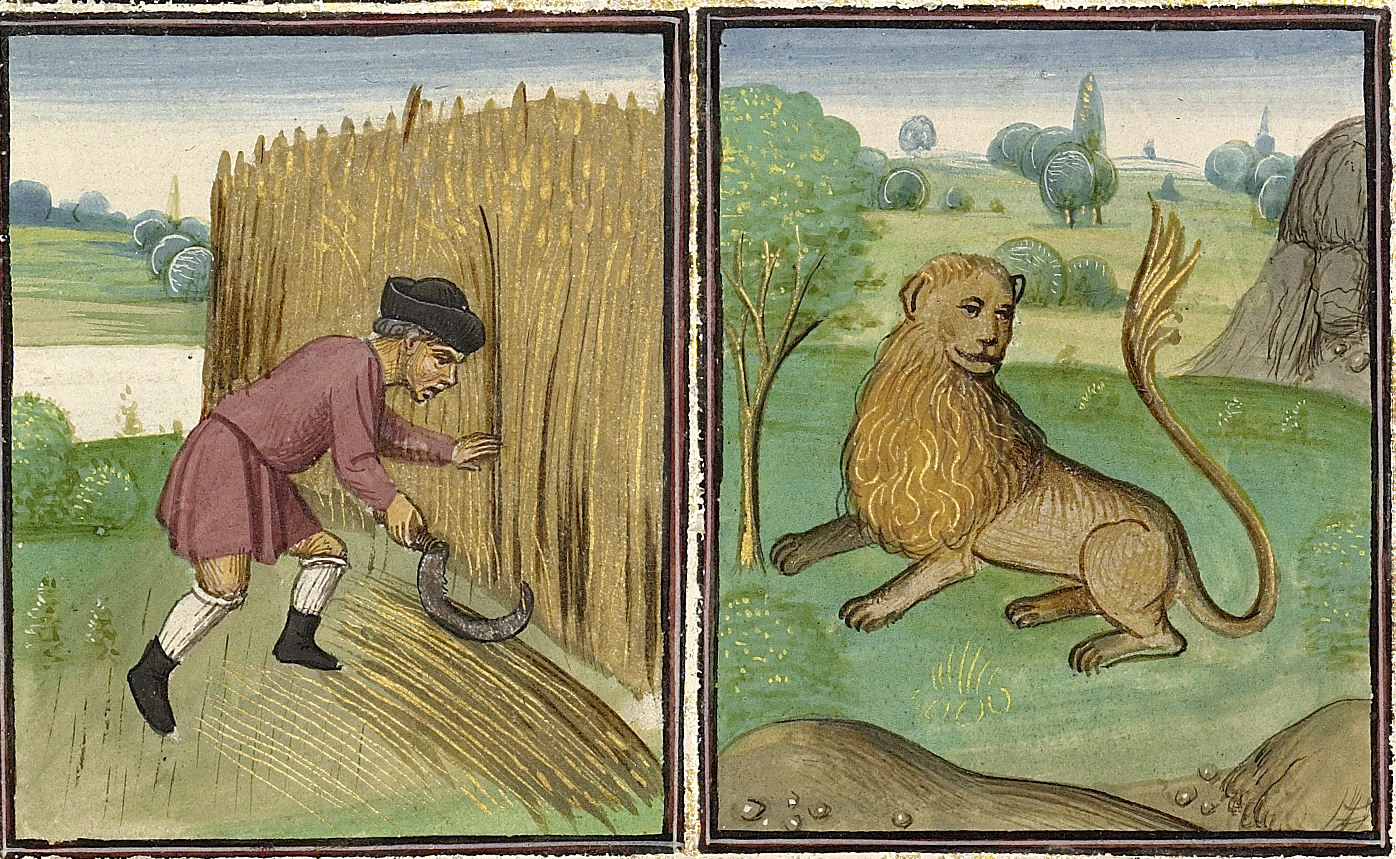 A Man Reaping, Zodiacal Sign of Leo; Workshop of Willem Vrelant, Flemish, died 1481, active 1454 – 1481; Bruges, Belgium, Europe; early 1460s; Tempera colors, gold leaf, and ink on parchment; Leaf: 25.6 x 17.3 cm (10 1/16 x 6 13/16 in.); 83.ML.104.7