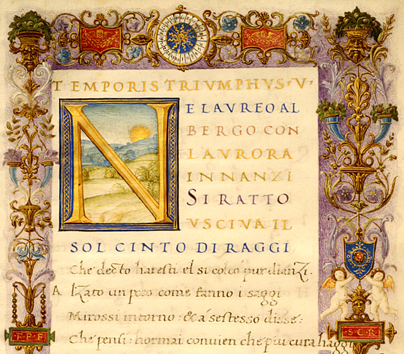 Iniziale "N" (Nel laureo albergo con l'aurora), miniatura tratta da 'I Trionfi' (Firenze, 1480 circa), Walters Art Museum, Baltimora.