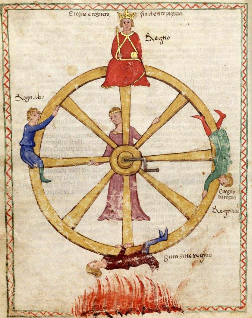 "La ruota della Fortuna", miniatura tratta da 'Raccolta di Omelie latine' (Liguria, XV secolo), Bibliothèque nationale de France, Parigi.
