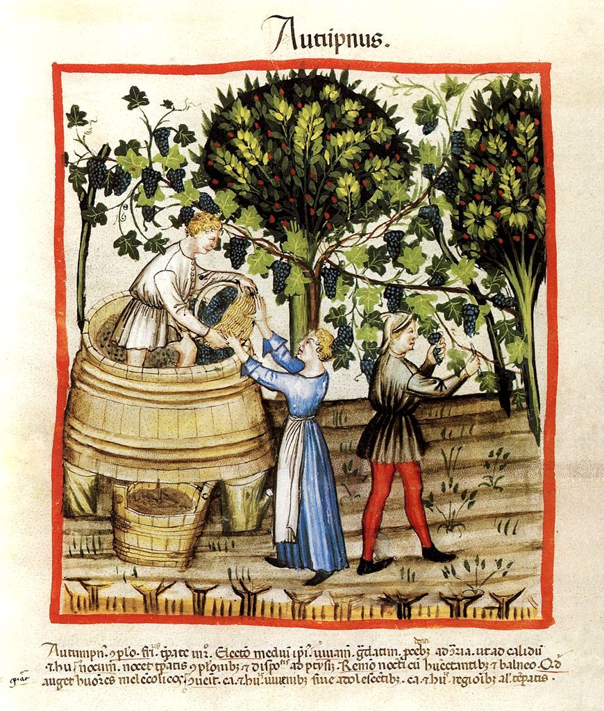 "L'autunno", miniatura tratta dal 'Tacuinum Sanitatis in Medicina' (fine XIV secolo), Österreichische Nationalbibliothek, Vienna. Il testo sotto la miniatura illustra le peculiarità dell'autunno: