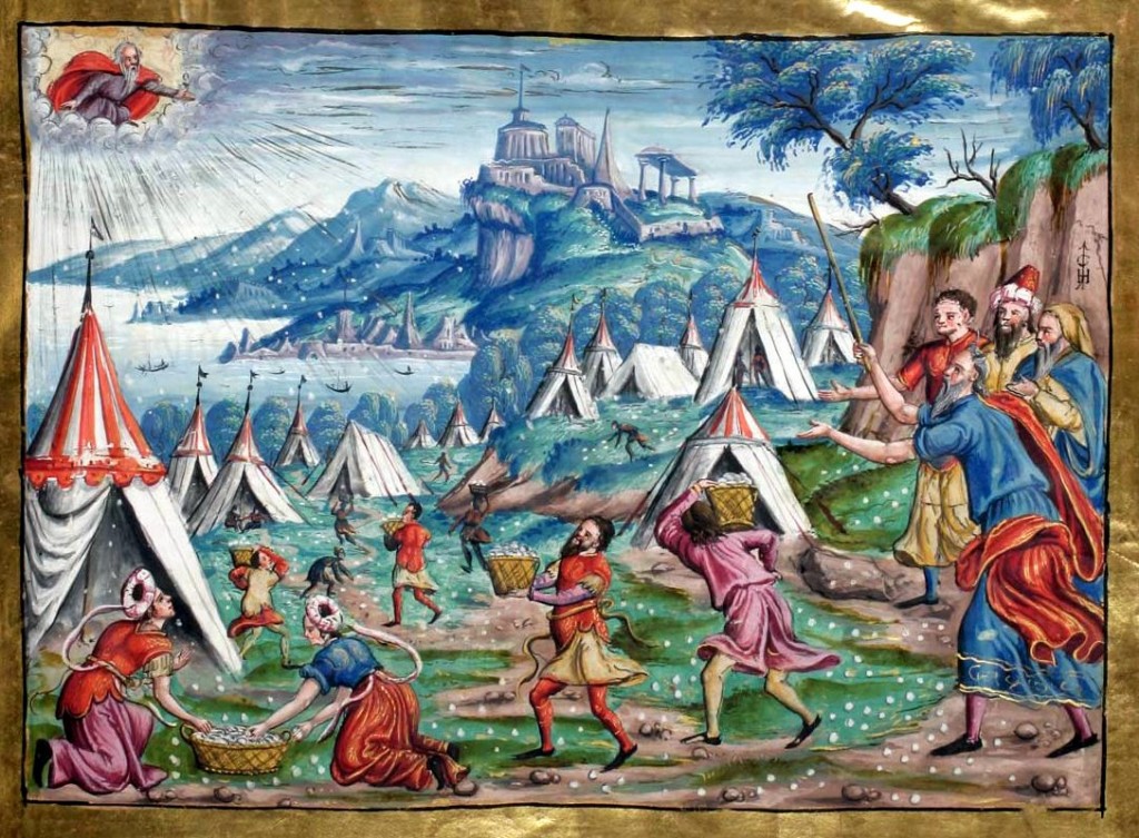 "Il popolo d'Israele raccoglie la manna caduta dal cielo", miniatura tratta da 'Canti a quattro voci per le principali festività dell'anno liturgico' (1562), Biblioteca dell'Abbazia di San Gallo, Svizzera.