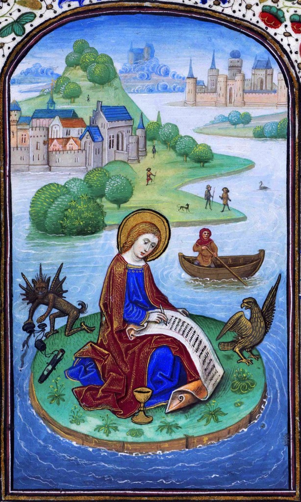 "San Giovanni Evangelista compone l'Apocalisse", miniatura tratta dal 'Libro d'Ore di Leonor de la Vega' (Fiandre, XV secolo), Biblioteca Nacionale de Espana, Madrid.