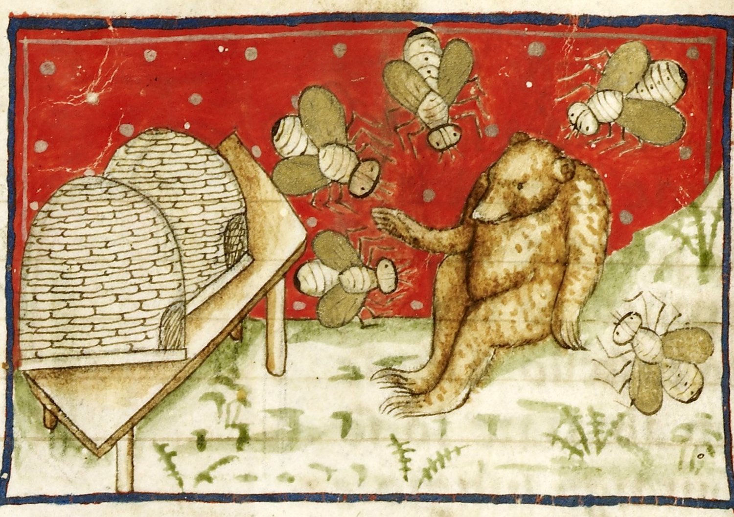 miniature of a bear with bees and a beehive.