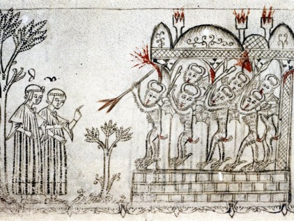 "Dante e Virgilio alle porte della Città di Dite", illustrazione tratta dalla 'Divina Commedia' (Italia meridionale, seconda metà del XIV secolo), Bodleian Library, Oxford.
