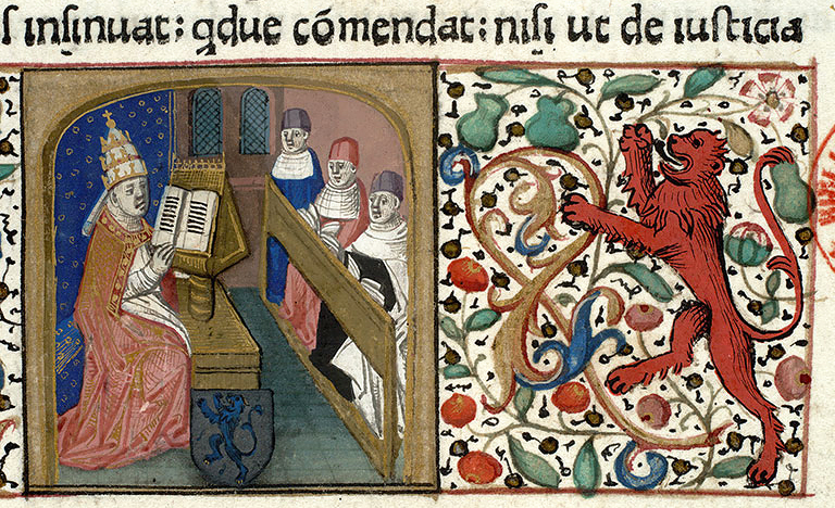 "Leone I insegnante", miniatura tratta dall'incunabolo "Sermones et epistolae", inc. 0021, c. 005, dopo il 1470, Bibliothèque Mazarine, Parigi.