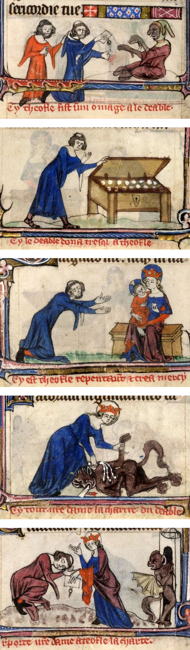 "Teofilo e il patto col diavolo", miniature tratte dalle 'Taymouth Hours' (Inghilterra, secondo quarto del XIV secolo), British Library, Londra.