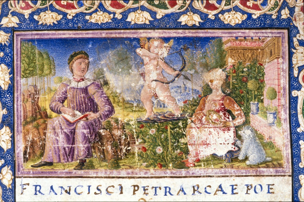 "Francesco Petrarca e Laura, con Amor che punta la sua freccia verso la donna", miniatura tratta da "Rime e Trionfi" (1465 circa), British Library, Londra.