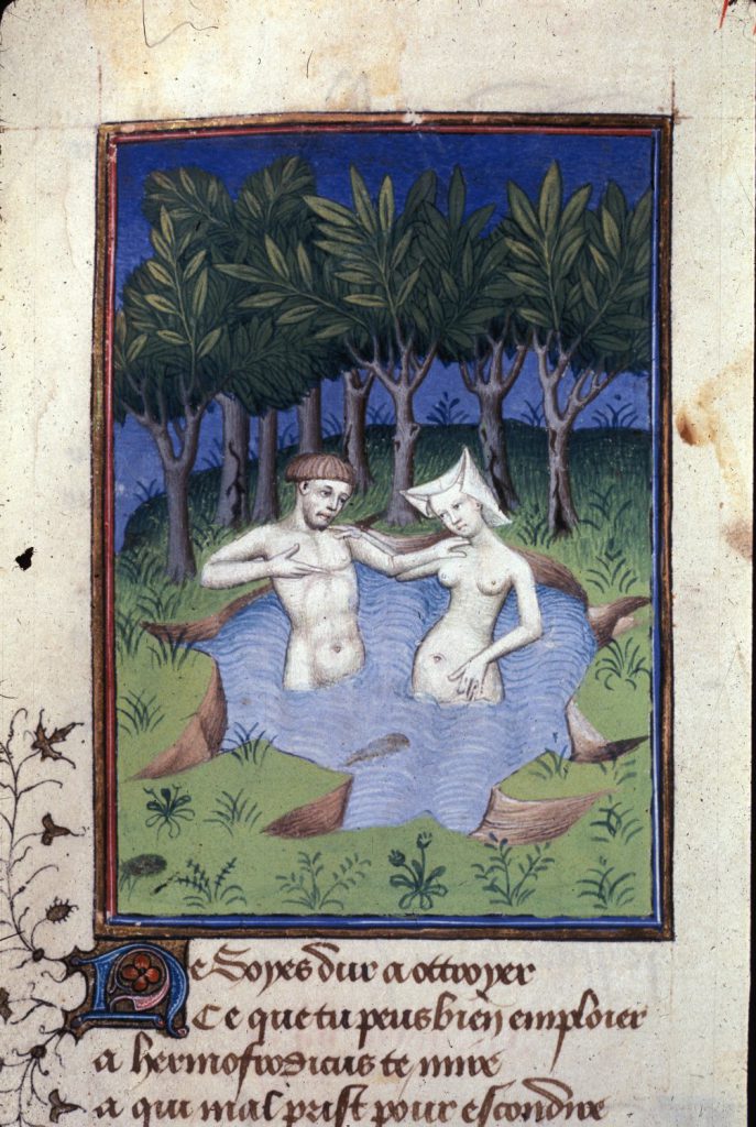 L’Ermafrodito e la ninfa Salmace fanno il bagno in un lago.