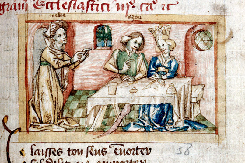 "Giovane ragazza corteggiata durante un pasto", miniatura tratta dal manoscritto "Decretum Gratiani", ms. 0558,…