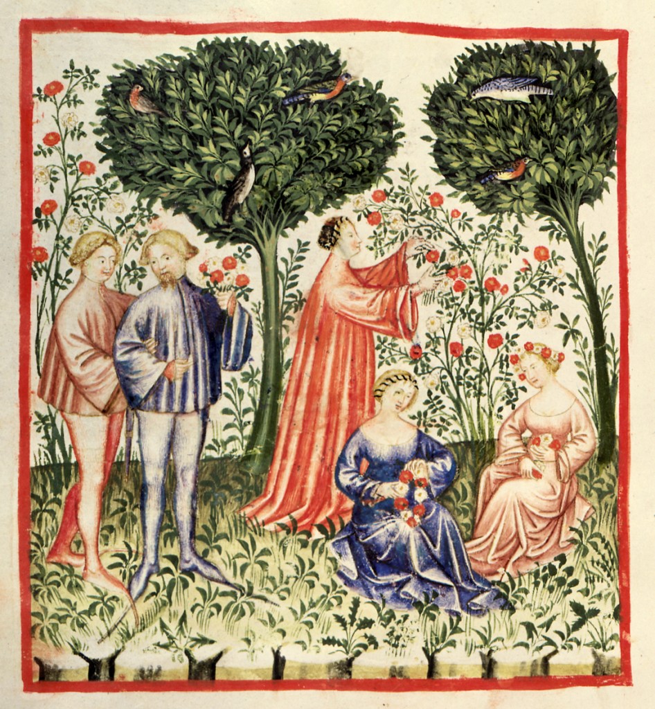 "Primavera", miniatura tratta da 'Theatrum Sanitatis' (Lombardia, XIV secolo), Biblioteca Casanatense, Roma.
