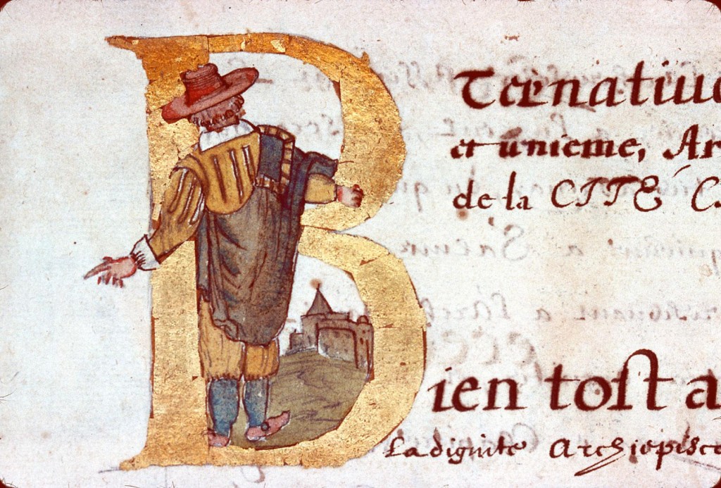 Iniziale "B" raffigurante un uomo di spalle, illustrazione tratta dal 'Catalogue et vie des évêques et archevêques de Besançon' (fine del XVI secolo), Bibliothèque municipale, Besançon.