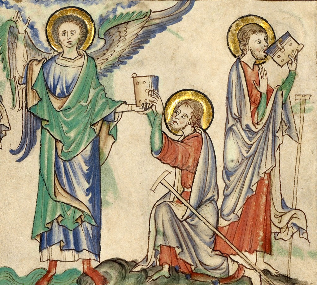 "San Giovanni mangia il libro ricevuto dall'angelo", miniatura tratta dalla 'Dyson Perrins Apocalypse' (Inghilterra, 1255 - 1260), Getty Museum, Los Angeles.