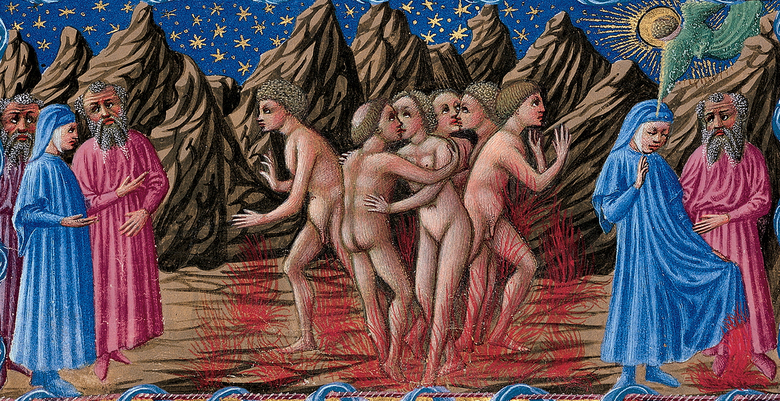 Accompagnato dalle sue guide, Virgilio e Stazio, Dante è ormai giunto “a l’ultima tortura”, la settima cornice della montagna del Purgatorio, occupata da fiamme di fuoco entro cui camminano i lussuriosi. In modo del tutto lineare, la miniatura segue lo sviluppo narrativo dei canti relativi all’ultima cornice, pur omettendo di visualizzare, con scelta consueta, gli esempi di lussuria punita e di castità gridati dai penitenti.
