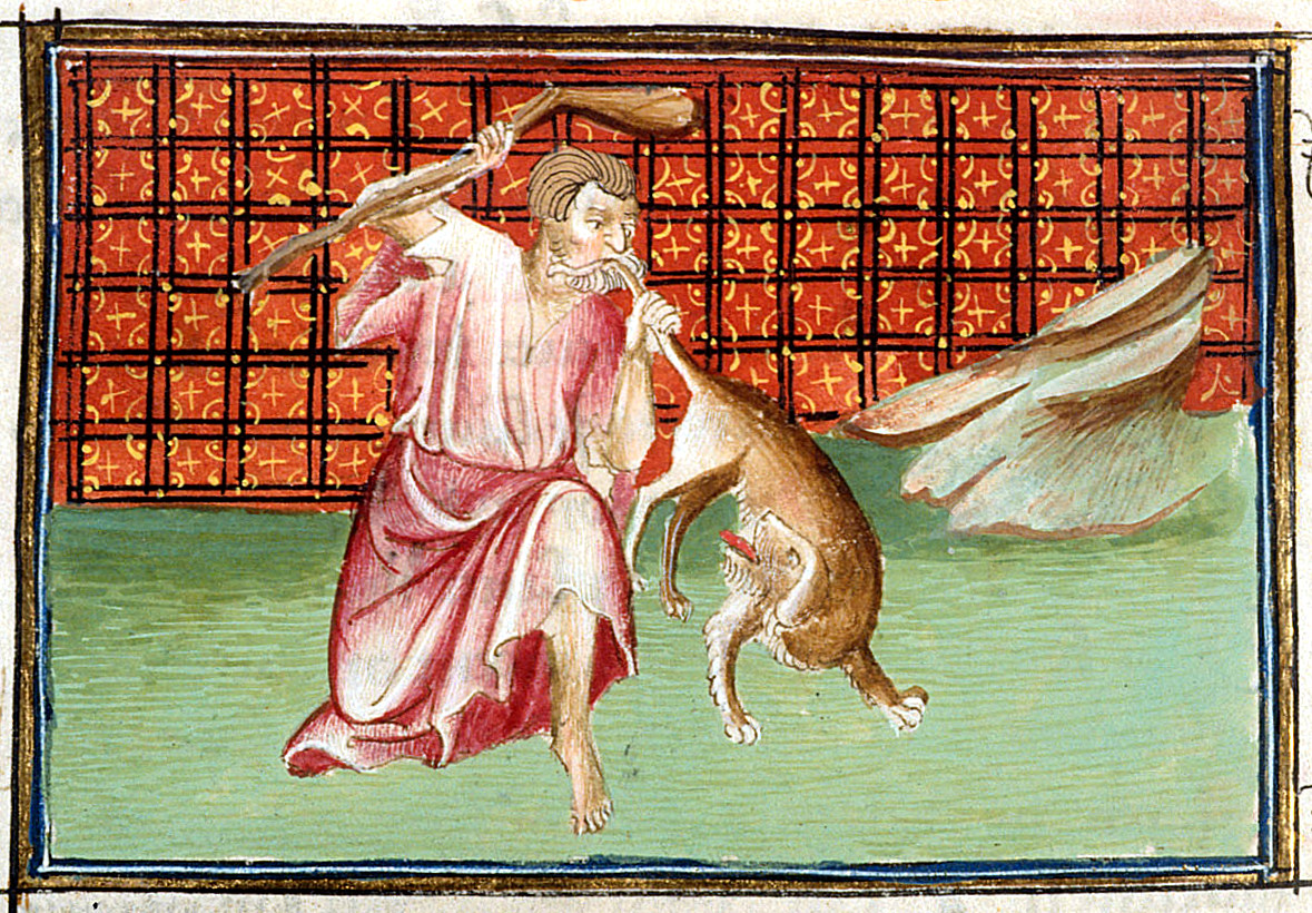 "Uomo morde un cane", miniatura tratta dalla 'Bible historiale complétée' (1418-1420), British Library, Londra.