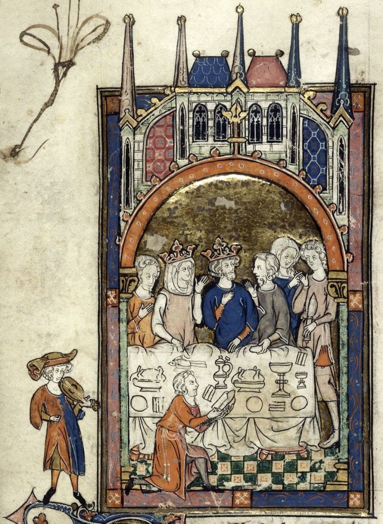 "Il banchetto di Re Artù", miniatura tratta da 'La Queste del Saint Graal' (1300-1315), British Library, Londra.
