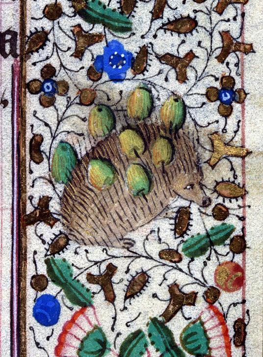 "Mele infilzate negli aculei di un riccio", miniatura tratta da Libro d'Ore all'uso di Roma (fine XV secolo), Bibliothèque Mazarine, Parigi.