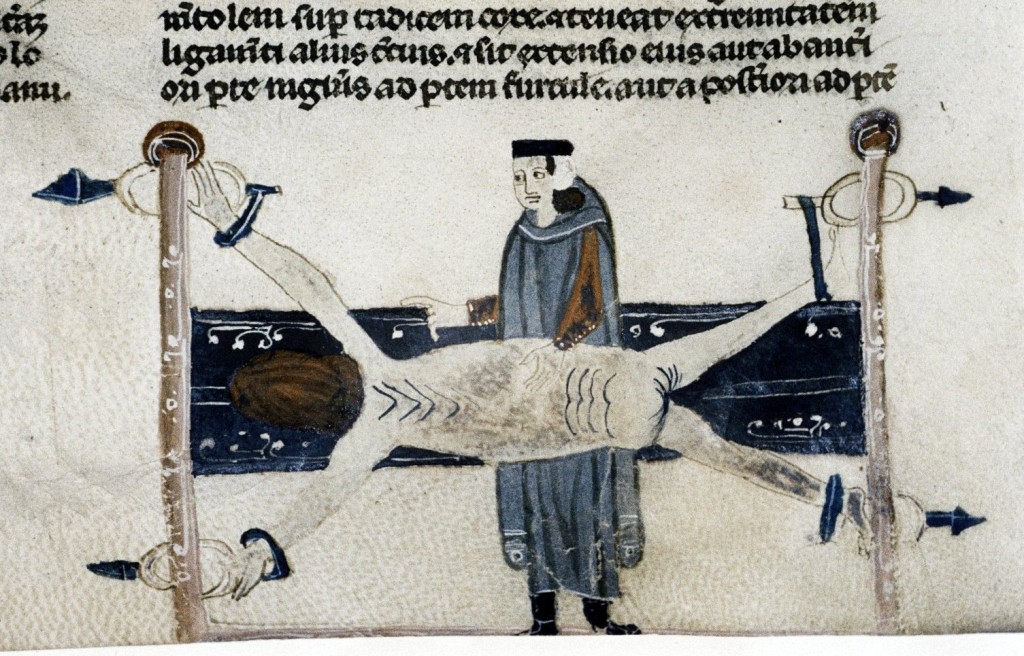 "Trattamento contro il mal di schiena", miniatura tratta dall'opera 'Trattati chirurgici' (fine del XIII secolo), Bodleian Library, Oxford.