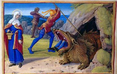 Illumination “St. Martha taming the Tarasque” from the manuscript “Hours of Henry VIII”, by Jean Poyer, ms. H.8, c. 191v, 16th century, Morgan Library, New York.