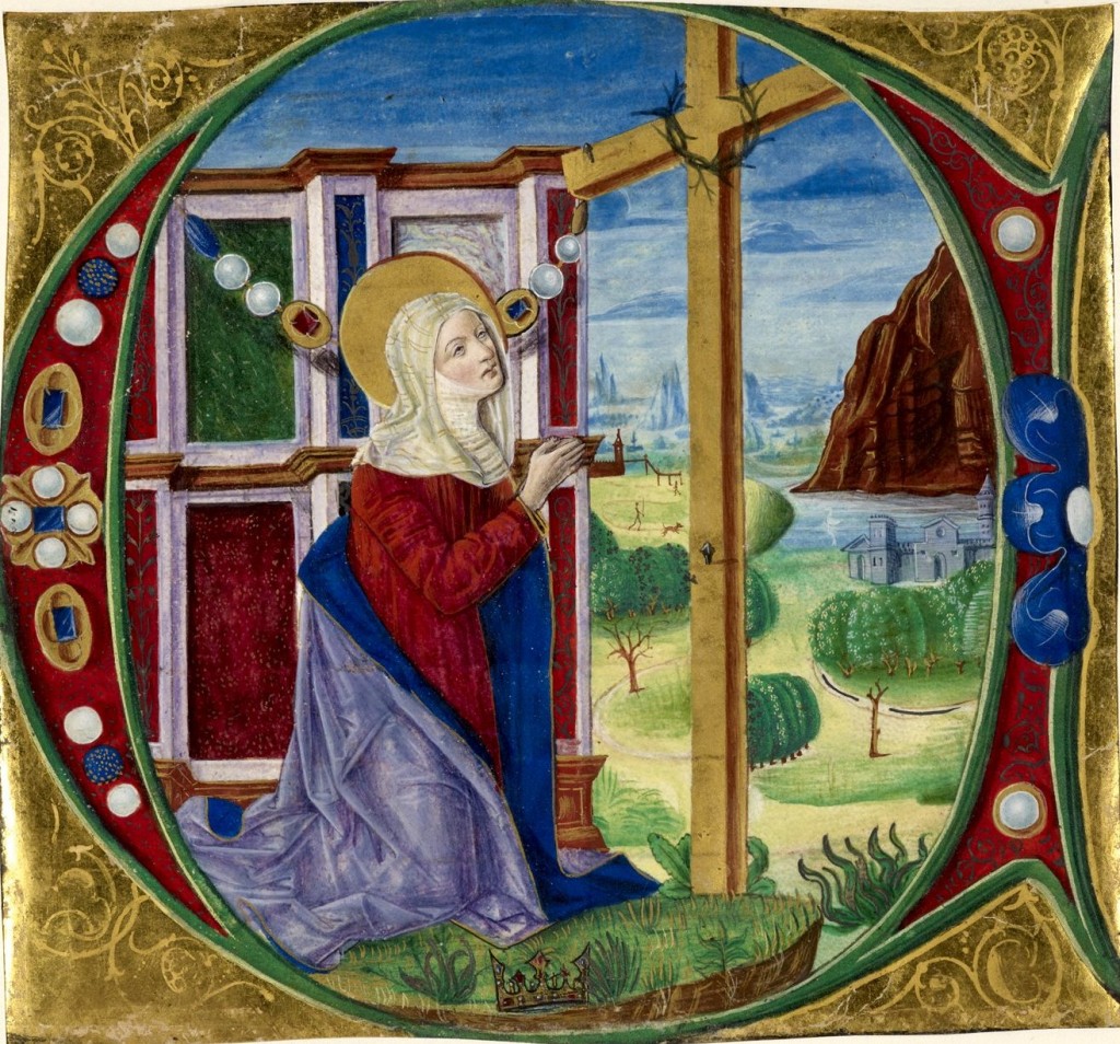 Iniziale "C" raffigurante "Sant'Elena prega davanti alla Croce", frammento da un Antifonario (1490-1510), British Library, Londra.